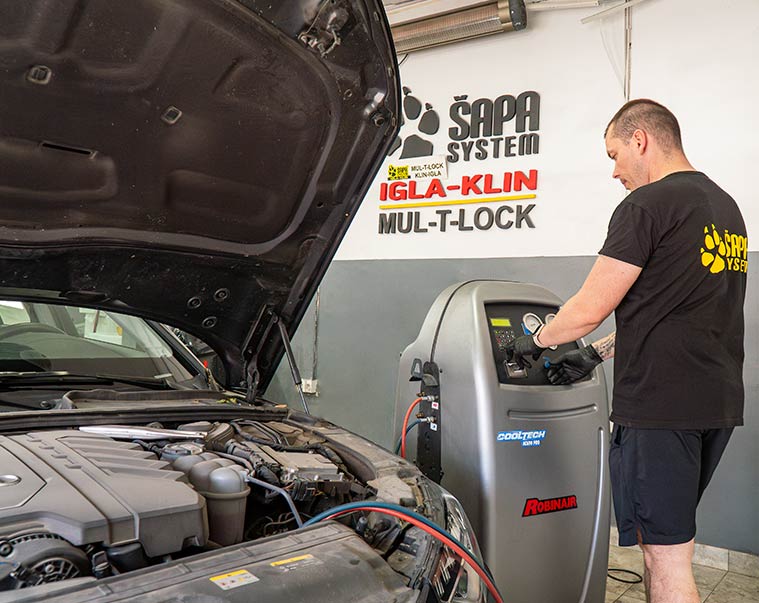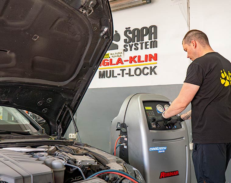 Sa položenim sertifikatom B naša firma se bavi punjenjem freona, menjanjem ulja i stavljanjem UV boje u auto klime, gde se pre svega vakumiraju i očiste creva i ventilacije.